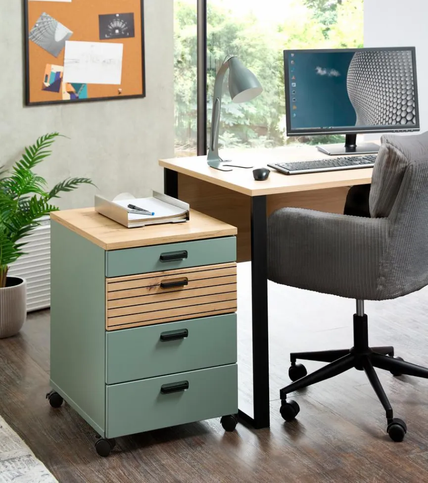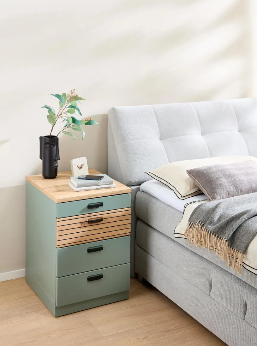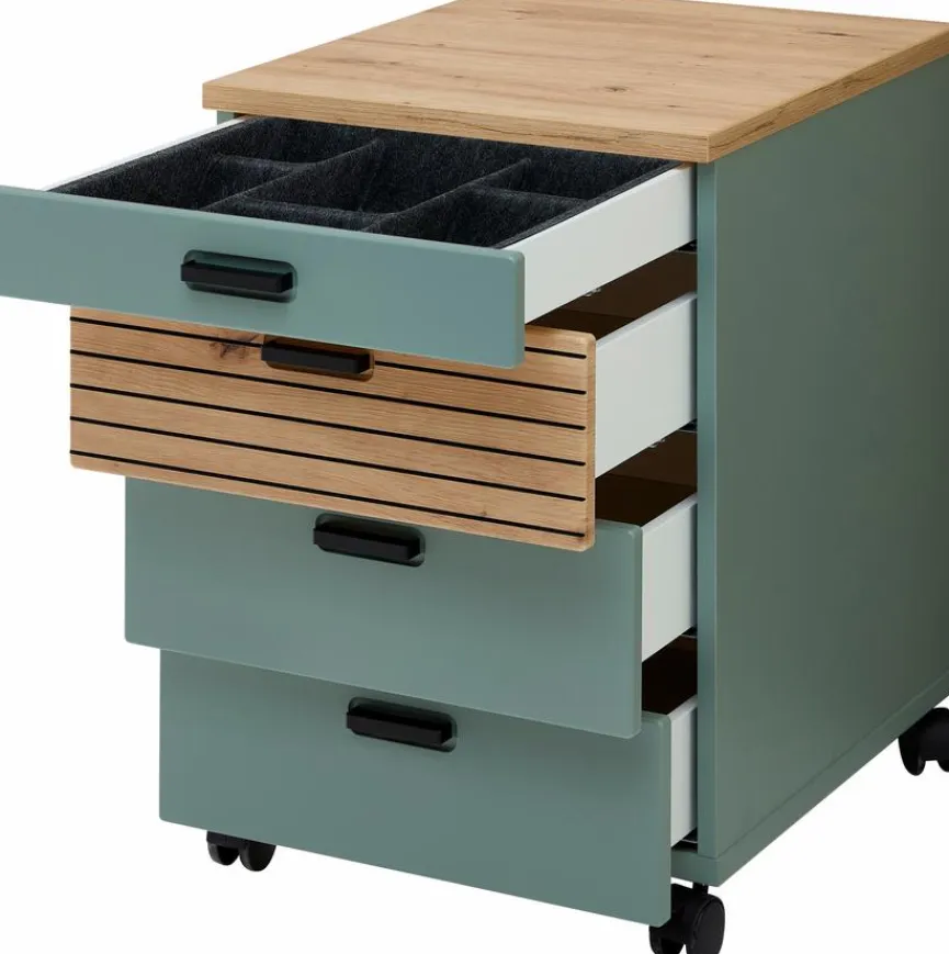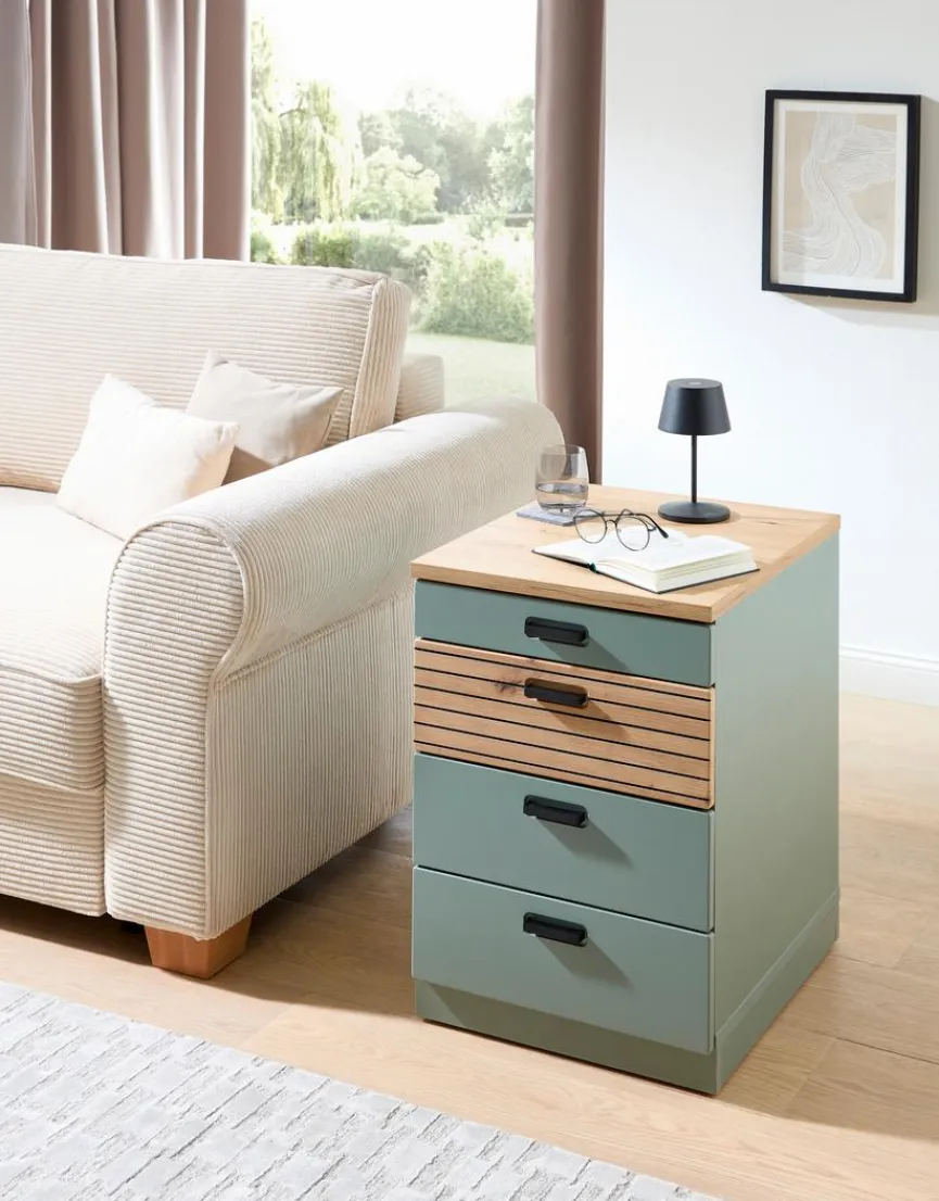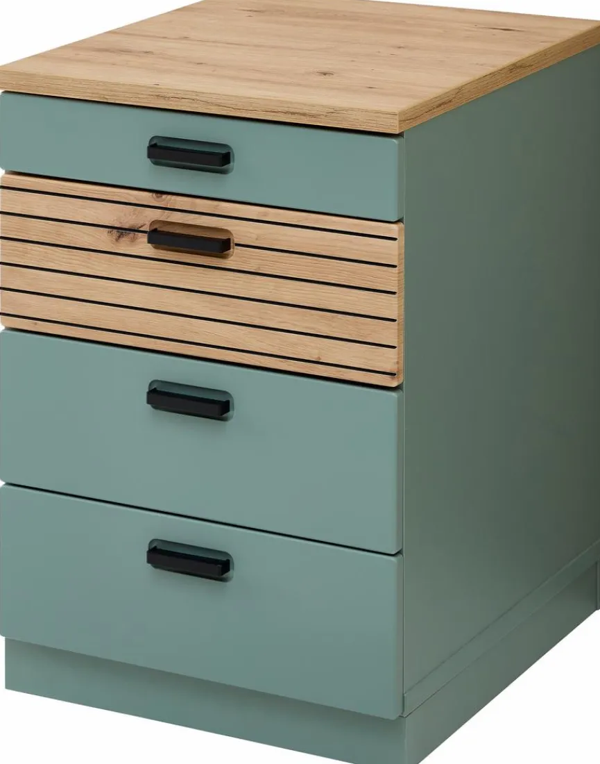 - Korpus aus Holzwerkstoff (Spanplatte) und Front aus Holzwerkstoff (MDF) mit hochwertiger Dekorfolie in Schilfgrün, mit Absetzung in Eiche Artisan