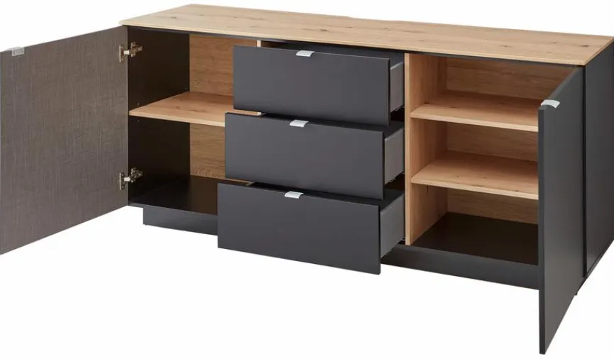 - Mit 2 Türen, 3 Einlegeböden und 3 Schubkästen mittig