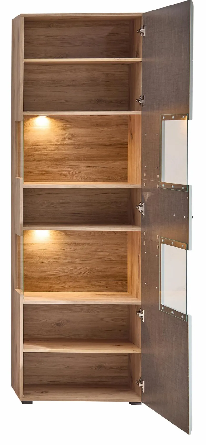 - Griffe aus Metall in schwarz matt, Füße aus Kunststoff in schwarz matt, Vitrinentüre mit Klarglas