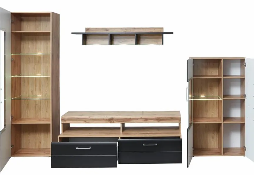 - Bestehend aus: 1 TV-Lowboard, 1 Standvitrine, 1 Highboard, 1 Wandboard