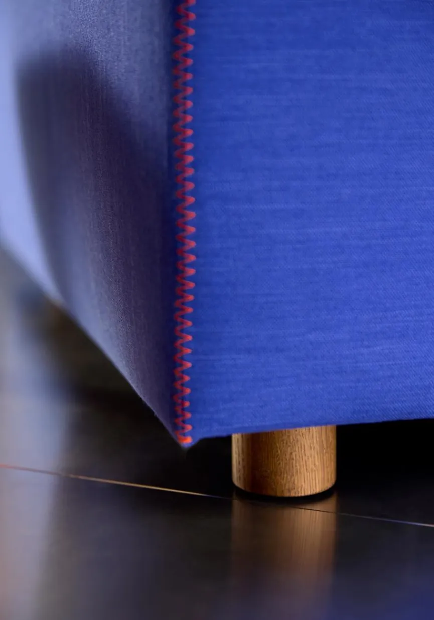 - Bezug aus Stoff (elegance) in ultramarine (512) mit orangefarbener Kontrasntaht, Füße aus massivem Eichenholz dunkel lackiert