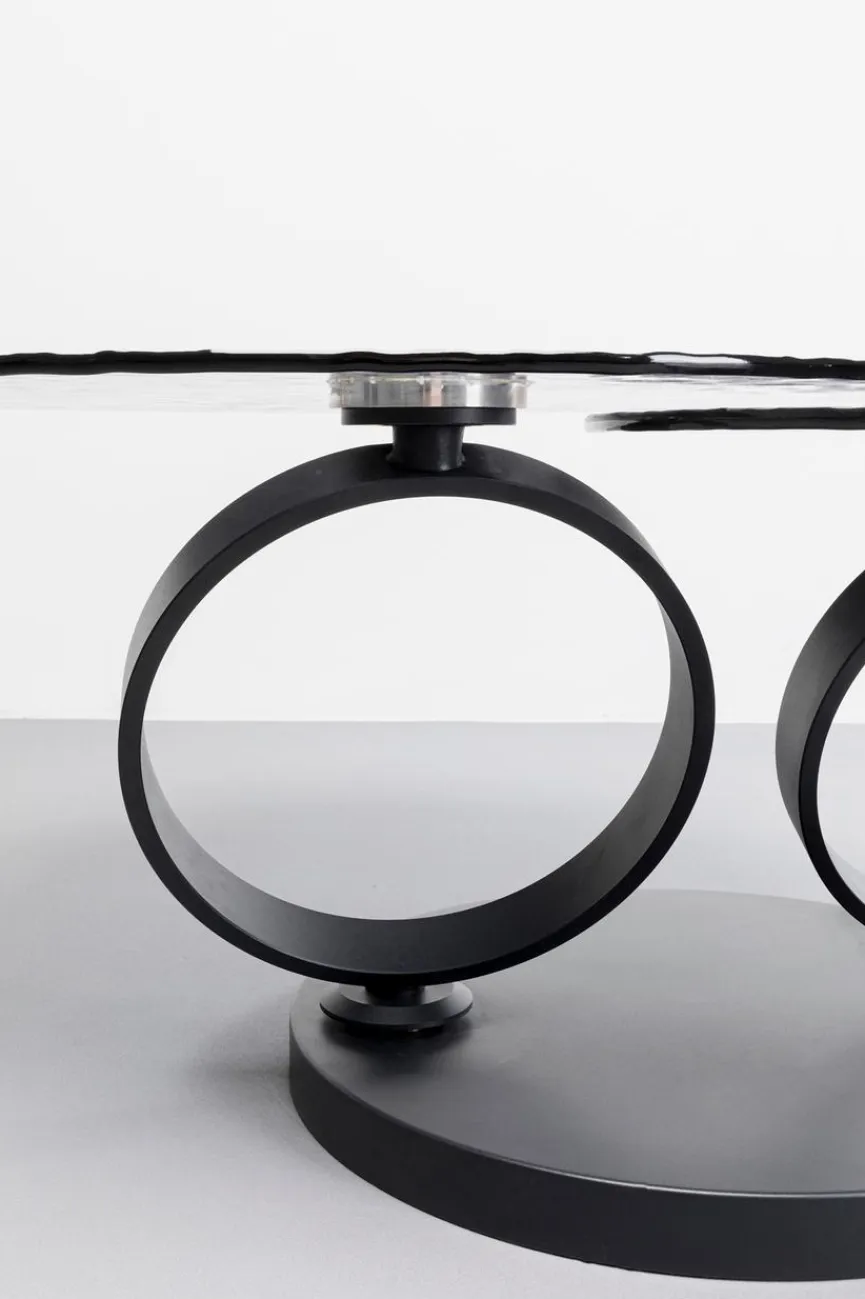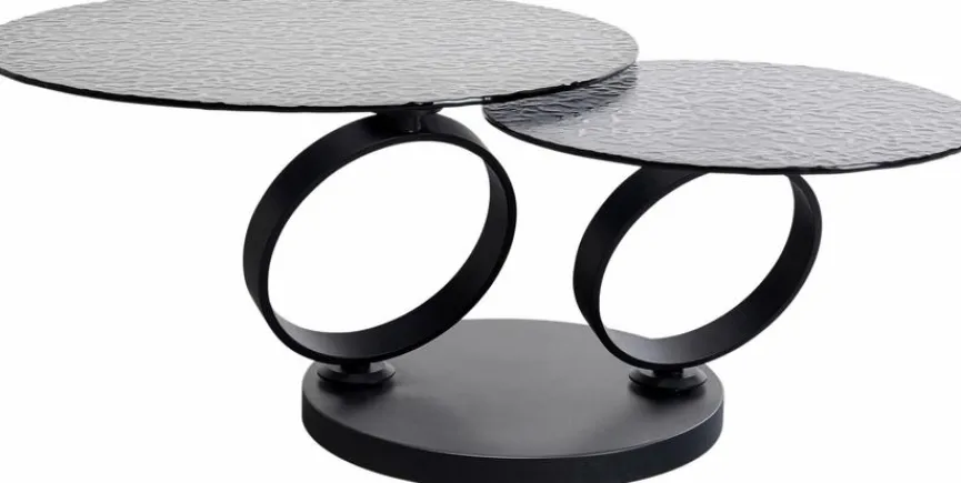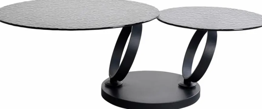 Der aparte Couchtisch Beverly 87650 von KARE DESIGN überzeugt mit Design und Raffinesse. Zwei runde Glastischplatten mit Reliefstruktur und passenden ringförmigen Untergestellen definieren diesen außergewöhnlichen Wohnzimmertisch. Die größere Tischplatte kann mithilfe ihrer Drehfunktion ganz nach außen oder über die kleinere gebracht werden. So wird sowohl die Tischform als auch die Größe seiner Oberfläche verwandelt, wodurch der Couchtisch Beverly 87650 zum skulpturalen Designobjekt avanciert.