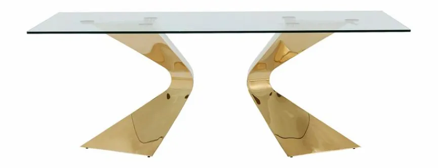 Der Esstisch Gloria Gold 200×100 cm der Marke KARE verbindet eine hohe Materialqualität mit einem trendigen Äußeren. Durch die extravagant geformten Edelstahl-Beine und die Platte aus Glas erhält der Esszimmertisch eine futuristische Optik, die sich perfekt in moderne Wohnumgebungen integrieren lässt. Darüber hinaus ist der Esstisch Gloria Gold 200×100 cm von KARE sehr stabil und robust.