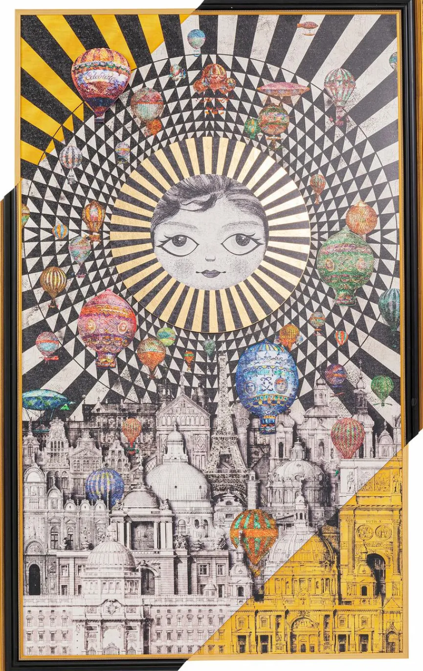 Das Wandbild Balloons 52979, das sowohl zu modernen als auch zu klassischen Möbeln passt, wartet mit einem spannenden dreidimensionalen Effekt auf. Schon alleine der Rahmen dieses Deko Bilds ist ein absoluter Blickfang. Zu sehen sind auf dem Wandbild Balloons 52979 ein sonnenartiges Element, Ballone und imposante Gebäudefassaden.