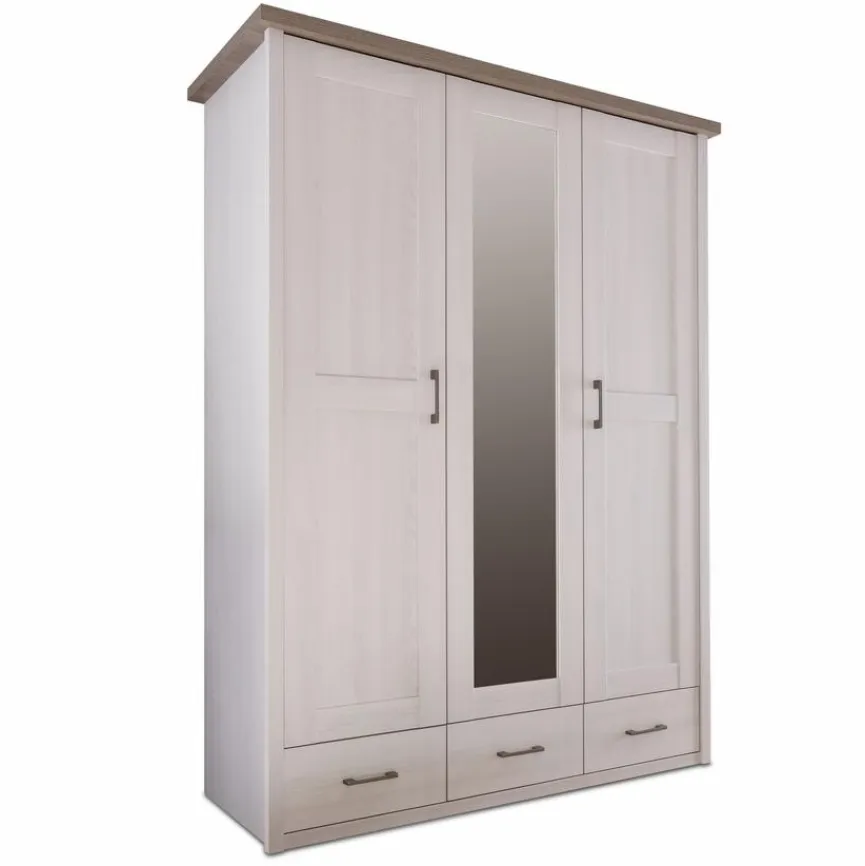 Der Kleiderschrank Luca, 148 x 201 cm ist ein moderner Kleiderschrank im Landhausstil. In ihm lässt sich Ihre Kleidung hinter zwei Holztüren, einer Spiegeltür und drei Schubkästen optimal verstauen. Fünf Böden und eine Kleiderstange bilden mit einer Mittelseite die Inneneinteilung des Schrankes. Die hochwertig gearbeitete Oberfläche macht den Kleiderschrank Luca, 148 x 201 cm, zum hübschen Blickfang in Ihrem zuhause.