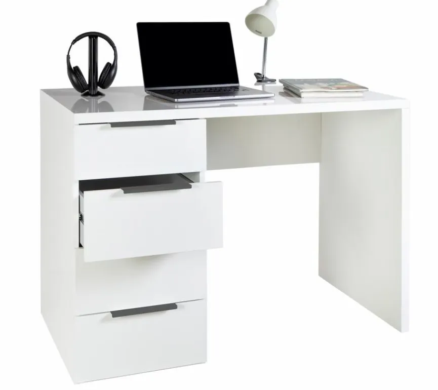 - Aus Holzwerkstoff (Spanplatte) mit kratzfester Melaminharzfolie in Hochglanz Weiß, Korpus von Kleiderschrank und Schreibtisch aus Holzwerkstoff (Spanplatte) in Weiß Matt