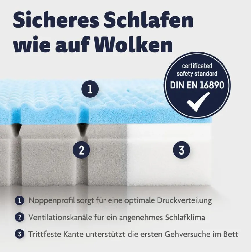- Mit Noppenprofil und Würfel-Pads auf der Babyseite – für optimale Oberflächenbelüftung, Kaltschaumbasis auf der Kleinkindseite