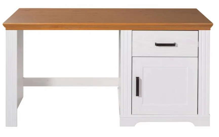 - Aus massiver und lackierter Kiefer in weiß, Deckplatte von Schrank, Nachttisch und Schreibtisch sowie Fries an Kopf- und Fußteil beim Bett in „Oak Colori“, Griffe aus Metall in schwarz