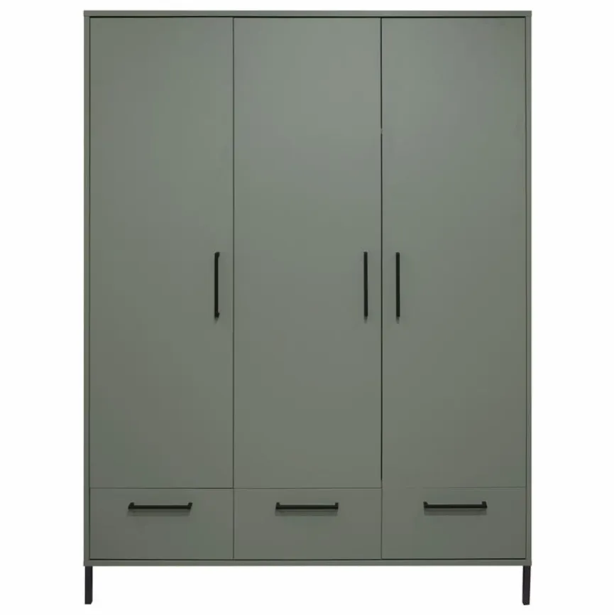 - Mit 3 Türen, 3 Schubkästen, 3 schmalen Böden, 1 breiten Boden und 1 Kleiderstange
