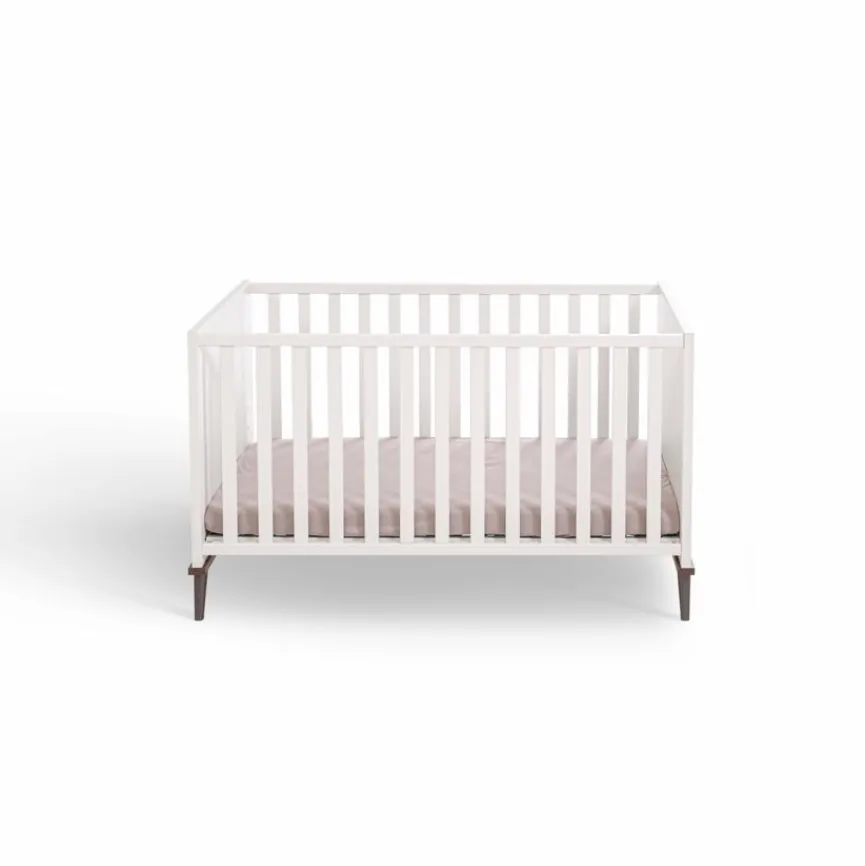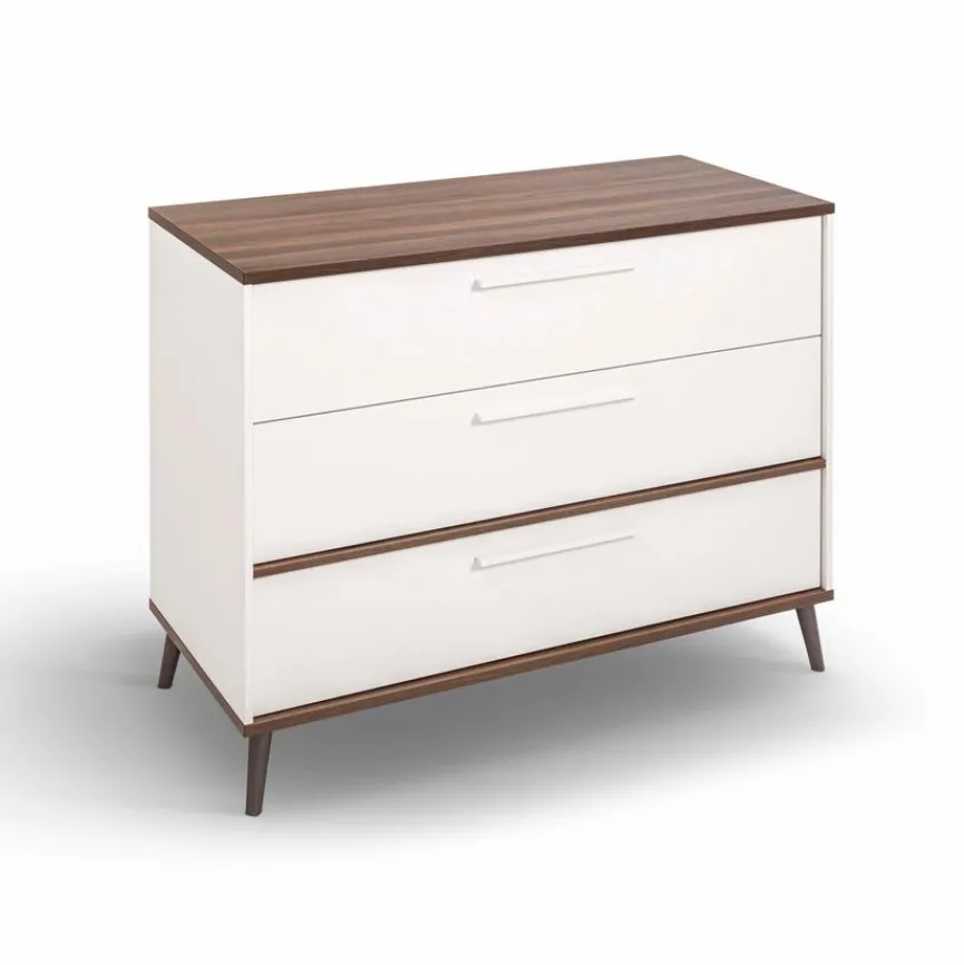 - Aus Holzwerkstoff (Spanplatte) mit kratzfester Melaminharzfolie in Off-White, Absetzungen aus Holzwerkstoff (Spanplatte) mit kratzfester Melaminharzfolie in Dark Walnut, Gitterseiten des Babybettes aus massiver und in Off-White lackierter Buche