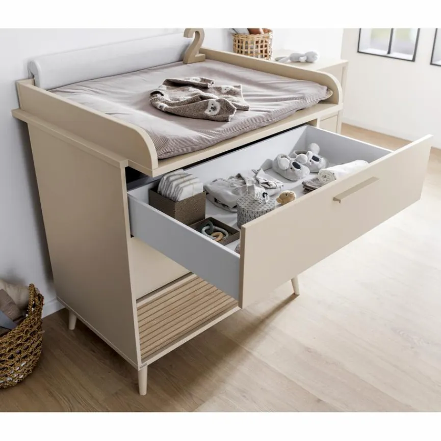 - Wickelkommode mit 2 Schubkästen in Cashmere-Beige und 1 Schubkasten in Eiche-Lamellenoptik, oberer Schubkasten mit Vollauszug, Schubkästen inkl. Softclose und Selbsteinzug