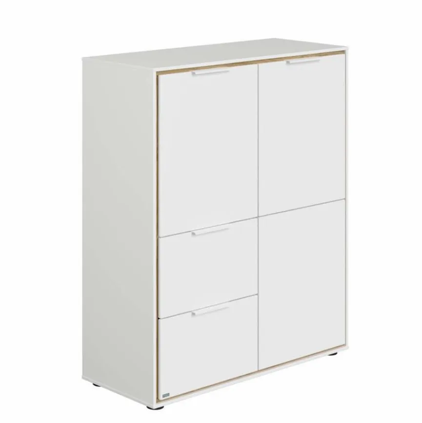 - Aus Holzwerkstoff (Spanplatte) mit kratzfester Melaminharzfolie in Kreideweiß, Innenkorpus und Einlegeböden aus Holzwerkstoff (Spanplatte) mit kratzfester Melaminharzfolie in Eiche-Montana-Nachbildung