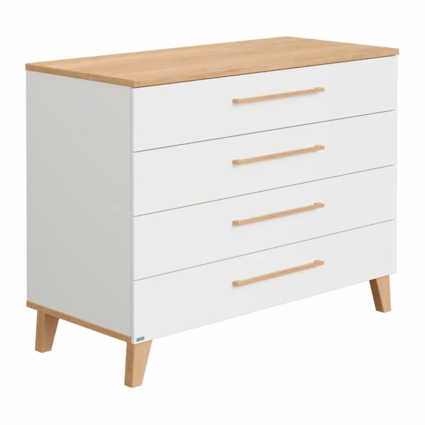 - Aus Holzwerkstoff (Spanplatte) mit kratzfester Melaminharzfolie in weiß, Absetzung in Eiche-Nebraska-Nachbildung, Füße und Griffe aus massiver Eiche