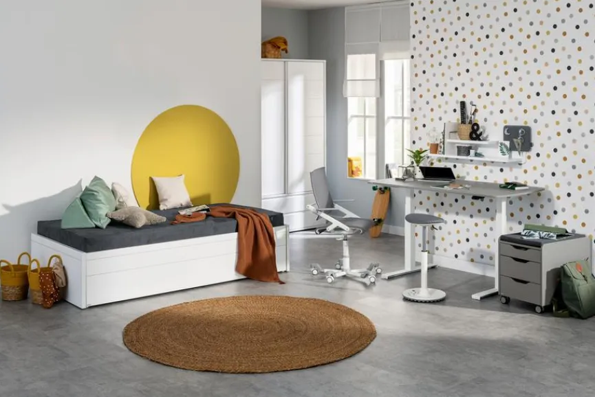 - Atmungsaktiver Bezug aus Stoff in grau, Keine störenden Schrauben dank Thermo-Bespannungstechnik