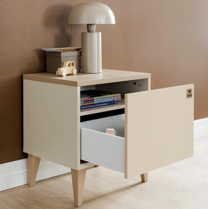 Die Nachtkommode Mila & Ben von Paidi punktet sowohl in Sachen Funktionalität als auch im Hinblick auf die ästhetischen Aspekte. Eine grifflose Front verleiht dem Nachttisch ein herrlich puristisches Erscheinungsbild. Die Nachtkommode Mila & Ben stellt eine wunderschöne Ergänzung zu einem Jugendbett aus diesem Programm dar.