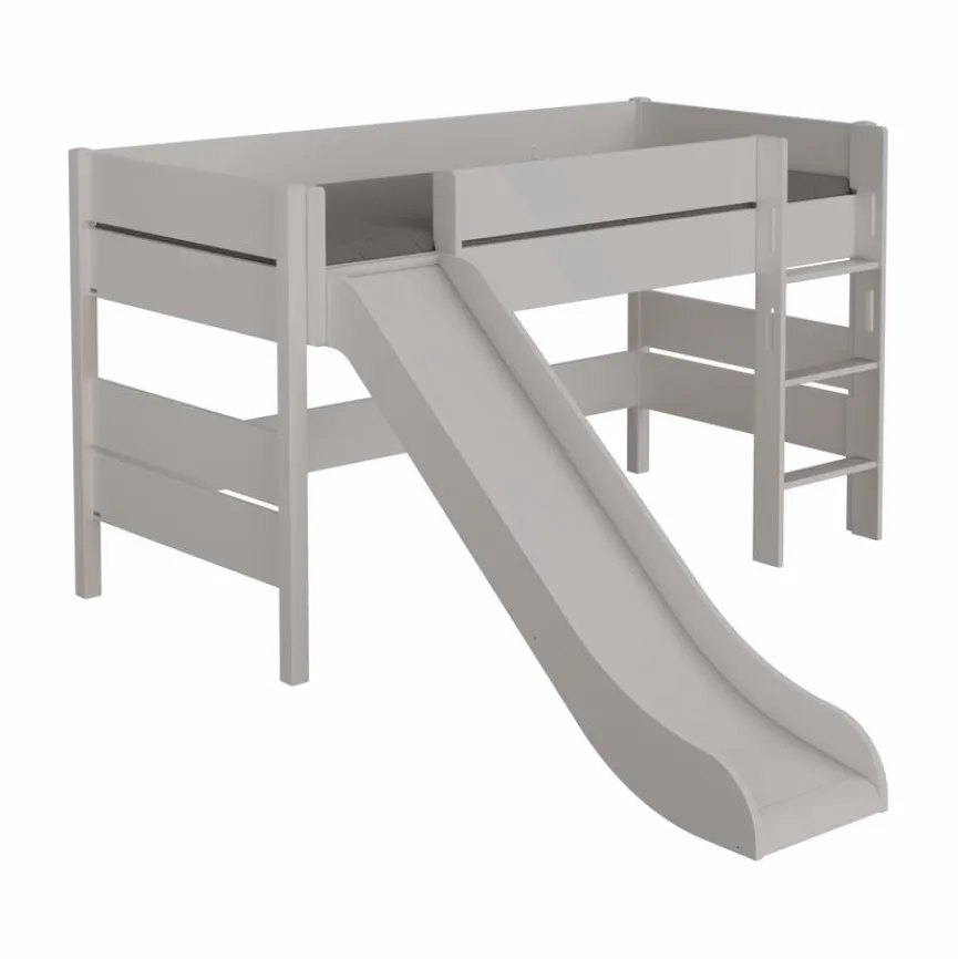 - Aus Holzwerkstoff (Spanplatte) mit kratzfester Melaminharzfolie in kieselgrau, Bettpfosten, Rutsche und Leiter aus massiver und kieselgrau lackierter Buche