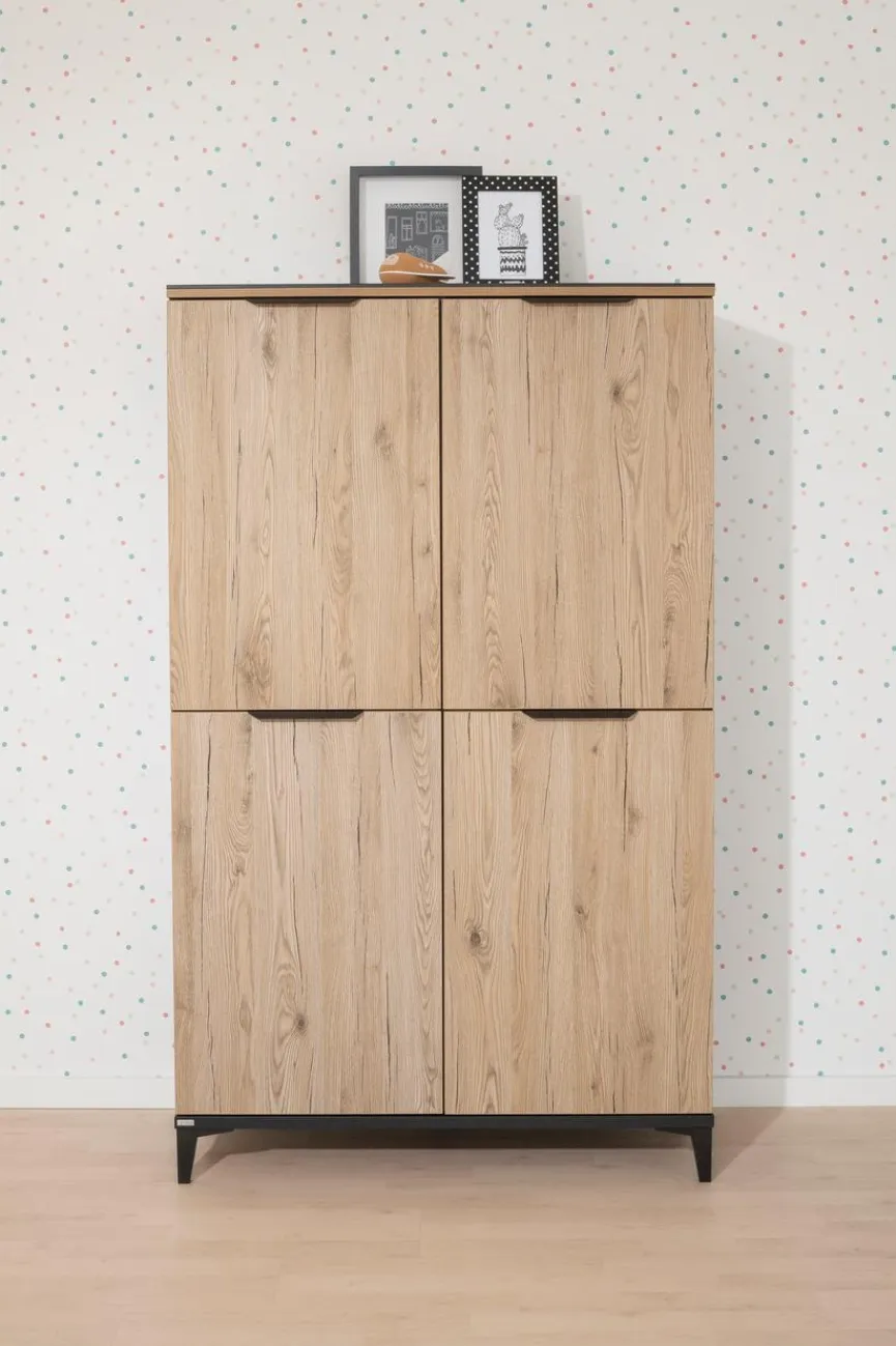 - Aus Holzwerkstoff (Spanplatte) mit kratzfester Melaminharzfolie in Naturschwarz, Kontrastkante, Türen und Einlegeböden aus Holzwerkstoff (Spanplatte) mit kratzfester Melaminharzfolie in Eiche-Bordeaux-Nachbildung