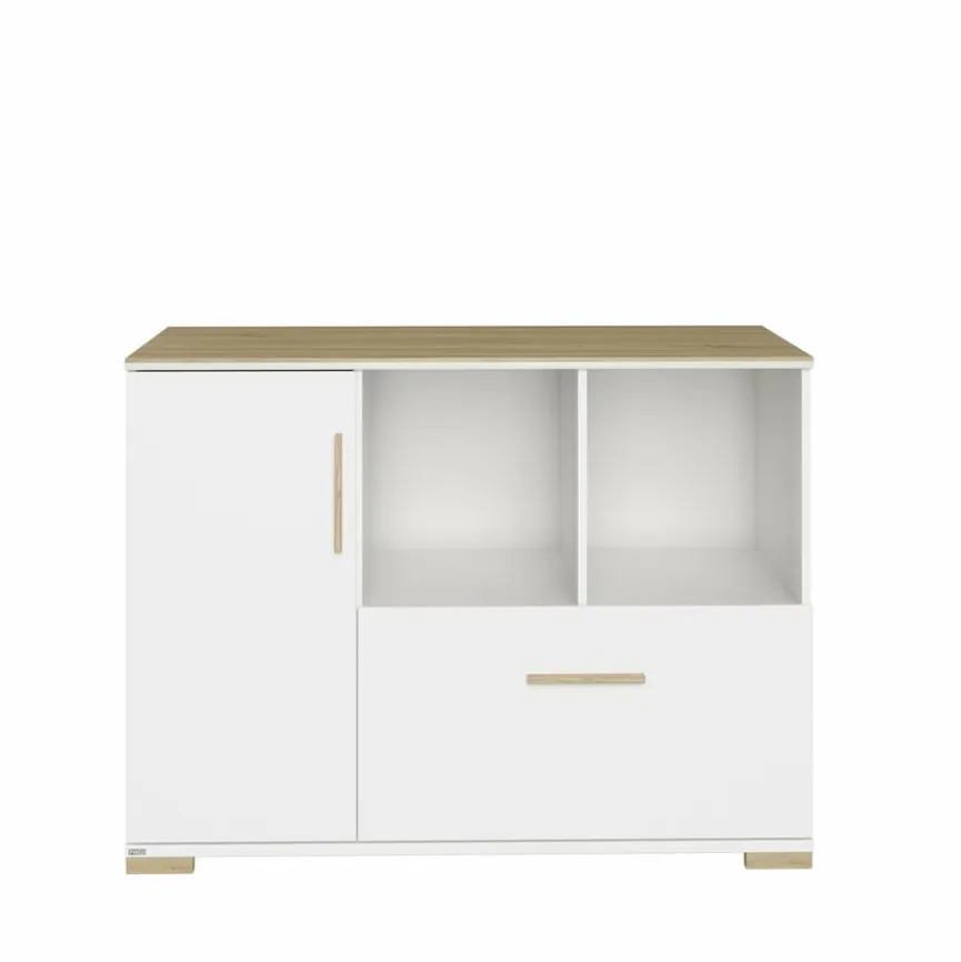 - Mit 1 Tür, 1 Einlegeboden, 1 Schubkasten und 2 offenen Fächern