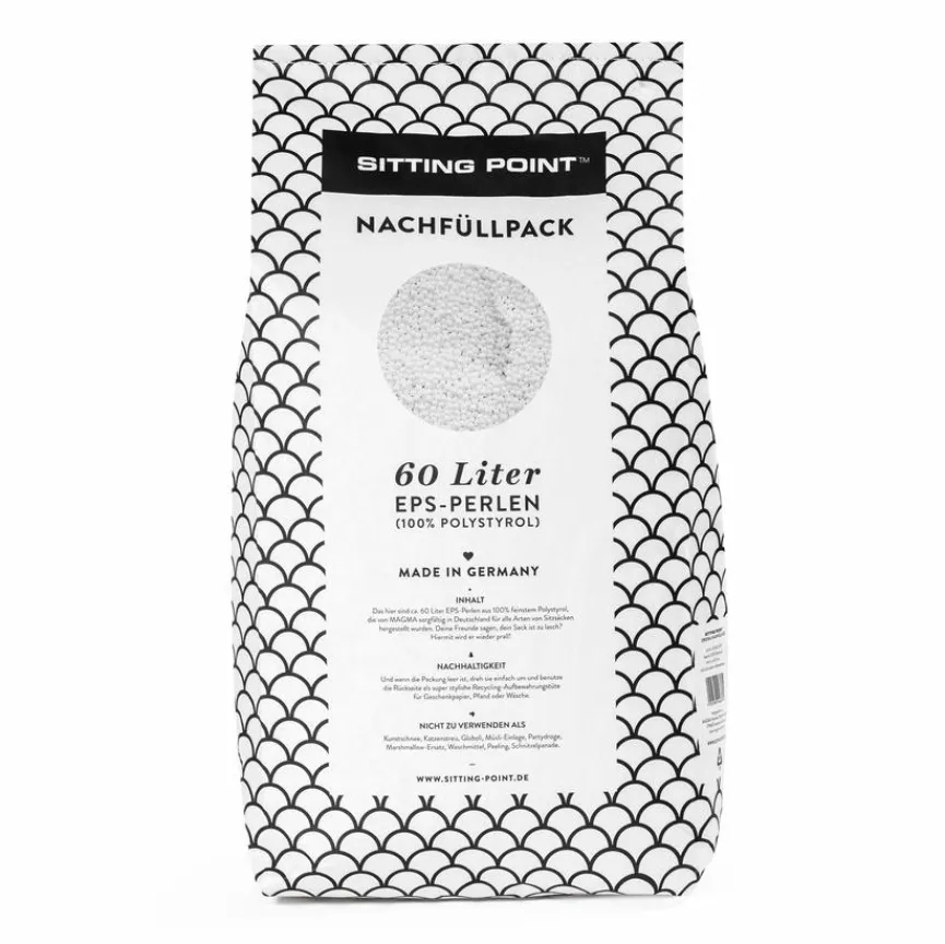 Das hier sind ca. 60 Liter EPS-Perlen aus 100% feinstem Polystyrol, die von Sitting Point sorgfältig in Deutschland für alle Arten von Sitzsäcken hergestellt wurden. Wenn die Packung leer ist, drehen Sie sie einfach um und benutzen Sie die Rückseite als super stylische Recycling-Aufbewahrungstüte für Geschenkpapier, Pfand oder Wäsche.
