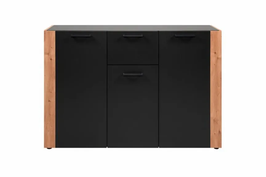 Mit der Kommode Cento verleihen Sie Ihren Wohnräumen etwas Besonderes, denn das trendige Design versprüht seinen ganz eigenen Charme. Dank der angesagten Kombination aus Holzoptik und tiefschwarzen Elementen trifft sie genau den Nerv der Zeit und wird mühelos zum Herzstück jedes Zimmers. Hinter drei Türen bietet Ihnen die Kommode Cento außerdem viel Platz für Nützliches und Liebgewonnenes.
