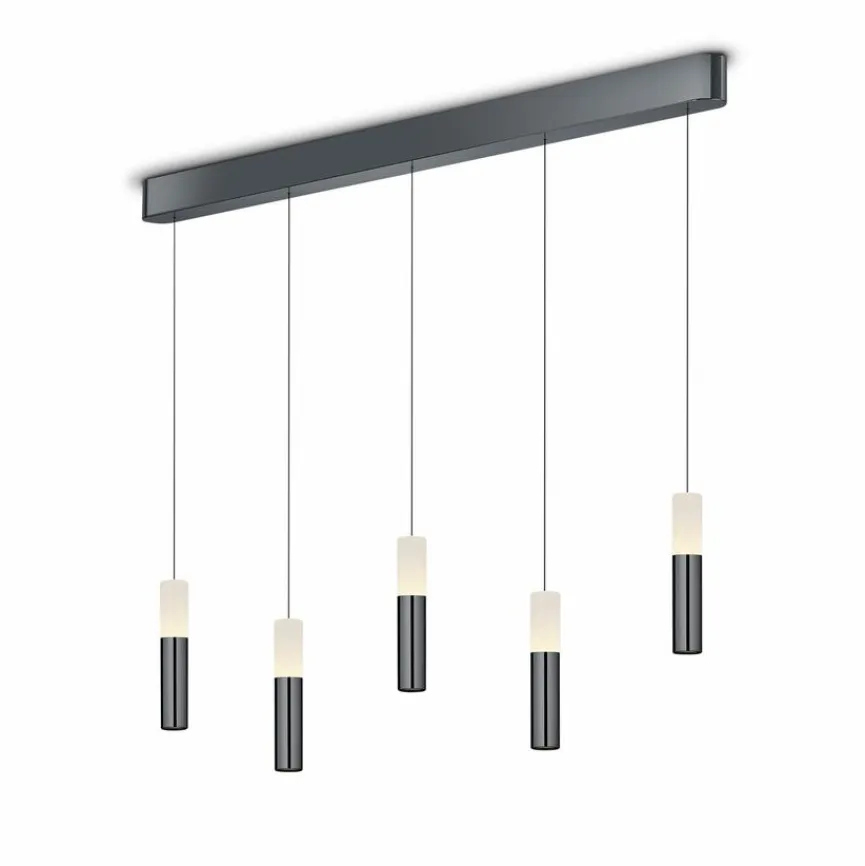 Stimmungsvolles raffiniertes Lichtdesign trifft bei der LED-Pendelleuchte Lidos von Helestra auf modernstes High-Tech. Die charmante LED-Pendellampe lässt ihr Licht dank fünf zylindrischer Leuchtkörper, die an filigranen Drähten befestigt und auf Wunsch höhenverstellbar sind, ins Ambiente fluten. Egal, ob die LED-Pendelleuchte Lidos den Ess-, Couch- oder Konferenztisch verschönert, sie ist ein fantastisches Stil-Statement und ein apartes Interior-Highlight.