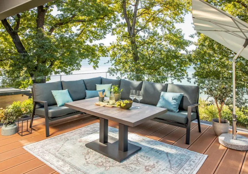 - Set bestelt aus 1x 2-Sitzer links, 1x 2-Sitzer rechts, 1x Ecke, 1x Mittelteil und Loungetisch