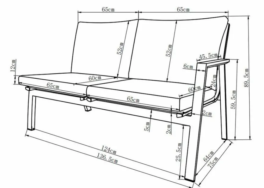 Sitzhöhe 33 cm; Sitztiefe: 60/57 cm; Sitzbreite 131/64/57 cm