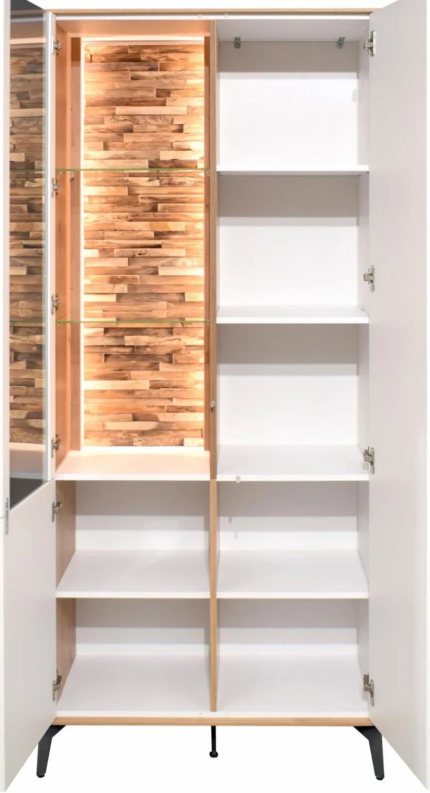 - Aus Holzwerkstoff (Spanplatte) mit kratzfester Melaminharzfolie in ice white supermatt mit Absetzung in Asteiche Nachbildung