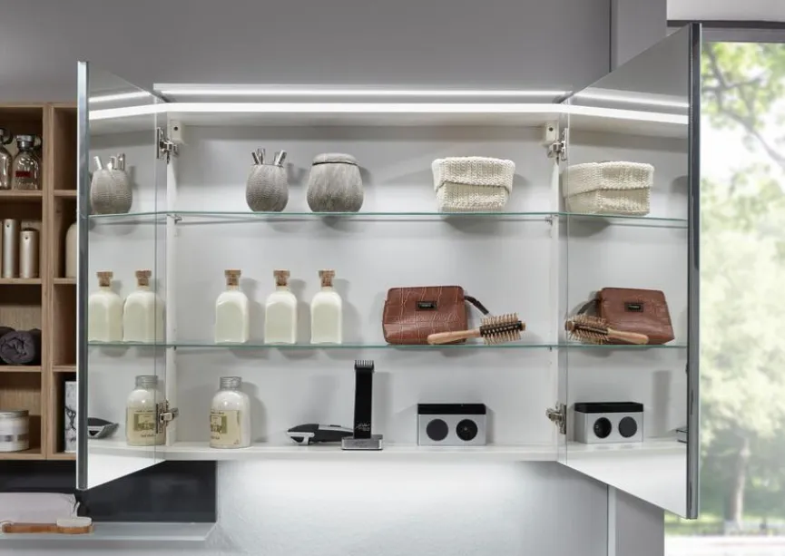 Der aus dem Hause Marlin stammende Spiegelschrank 3290 bildet in jedem Raum einen interessanten Blickfang. Mit seiner dezenten seitlichen LED-Beleuchtung setzt er alle Deko-Objekte gekonnt in Szene und schafft außerdem eine besondere Lichtstimmung im Raum. Zur individuellen Unterteilung des Innenraumes ist der Spiegelschrank 3290 von Marlin mit zwei Glaseinlegeböden ausgestattet.