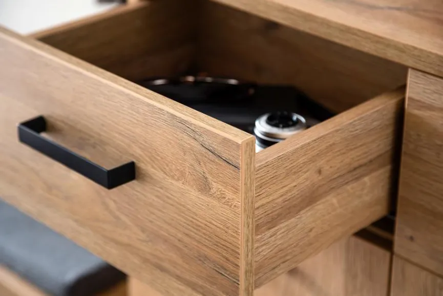 - Korpus und Front aus Spanplatte mit kratzfester Melaminharzfolie in Grandson Oak