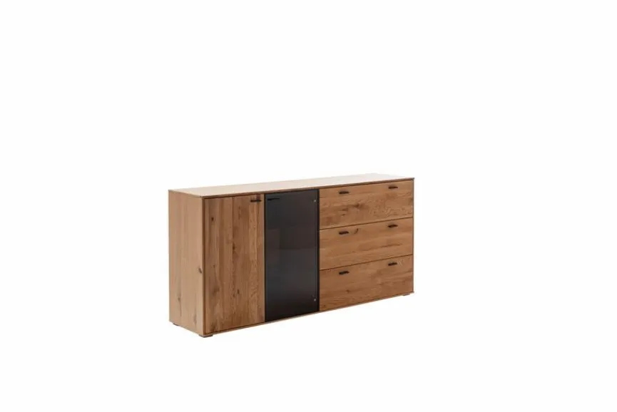 - Front aus Ast/Balkeneiche massiv, durchgehende Lamelle in Wildeiche geölt, Korpus aus Ast/Balkeneiche furniert in Wildeiche geölt