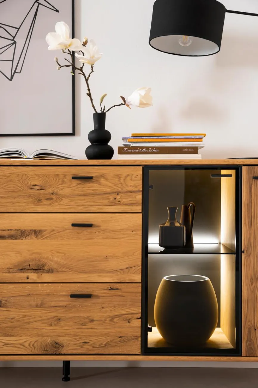 Dank seines zarten Gestells verzaubert das Sideboard Arezzo von MCA mit einer leichten, nahezu schwebenden Ausstrahlung. Die Kommode verbreitet ein natürliches Flair und passt ideal zum behaglichen, modernen Einrichtungsstil. Hinter der Glastür lassen sich schöne Deko-Objekte arrangieren, und in den Fächern und Schubkästen bietet das Sideboard Arezzo viel Stauraum für liebgewonnene Dinge, die Sie aufbewahren möchten.