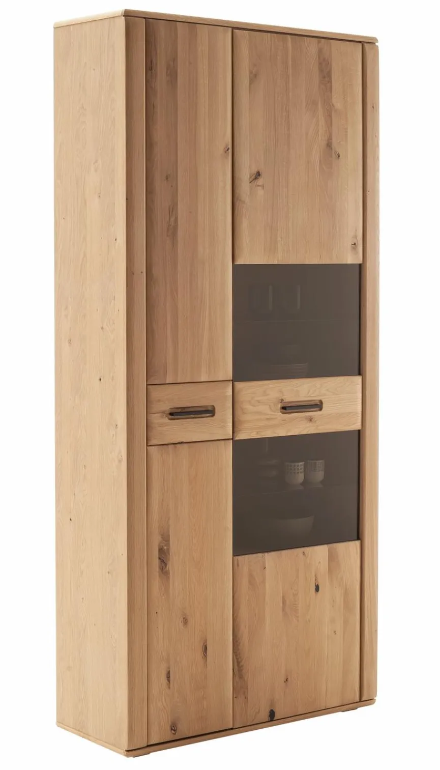 - Sichtbare Rückwand aus Holzwerkstoff (HDF) mit 3D Ast/Balkeneiche Nachbildung geschroppt, Rückwand aus Holzwerkstoff (HDF) Ast/Balkeneiche Nachbildung, Frontglas aus ESG Parsol braun, Griffe aus Metall in Anthrazit