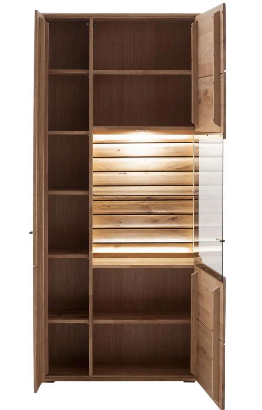 - Sichtbare Rückwand aus Ast/Balkeneiche Leisten massiv in Kristalleiche geölt mit Schattenfuge, Rückwand aus Ast/Balkeneiche furniert in Kristalleiche geölt, Frontglas aus ESG Parsol braun, Griffe aus Metall in Anthrazit