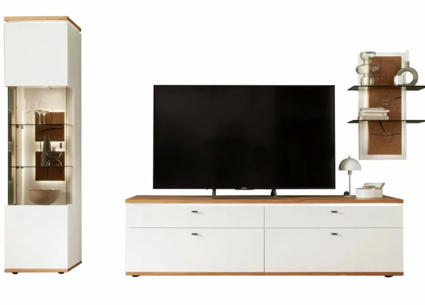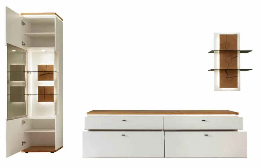 - Bestehend aus Vitrine, TV-Lowboard und Wandregal