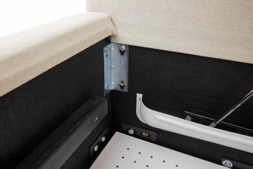 - Mit belüftetem Bettkasten und seitlich klappbarem Federholzrahmen, 28 Leisten mit 5-facher Härtegradverstellung, mit Mittelgurt und 5-facher Kopfteil-Rasterverstellung
