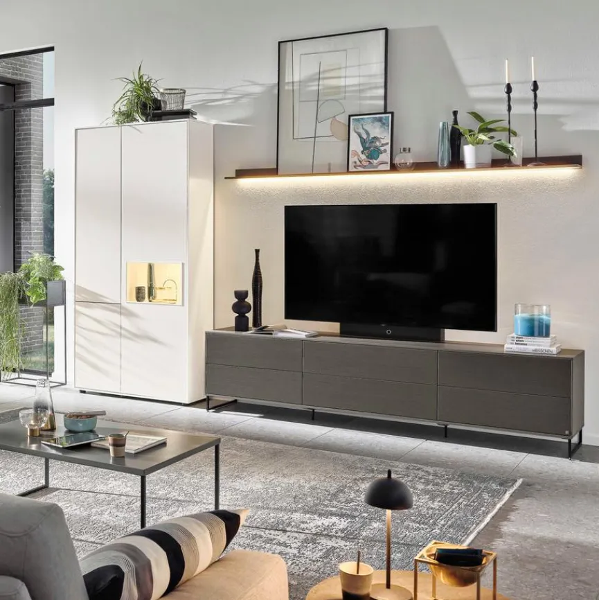 - TV-Lowboard mit 5 Schubkästen, 1 Klappe und 1 Kabeldurchlass