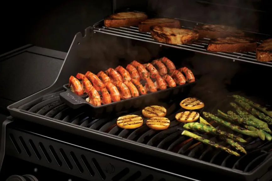 Das hochwertige Gusseisenschale Zubehör von Napoleon ist für BBQ-Spezialisten, Grillmeister und Feinschmecker eine fantastisches Accessoire, was sie gleichzeitig zum pfiffigen Männer- oder Gastgeschenk macht. Da es Hitze ausgezeichnet speichert und verteilt, steht einer perfekten Zubereitung von Gambas nichts im Wege. Holen Sie das Beste aus Ihrem maritimen Grillgut heraus und vermeiden Sie Verschwendung, denn das Gusseisenschale Zubehör verhindert das Festkleben und Durchrutschen durch den Rost.