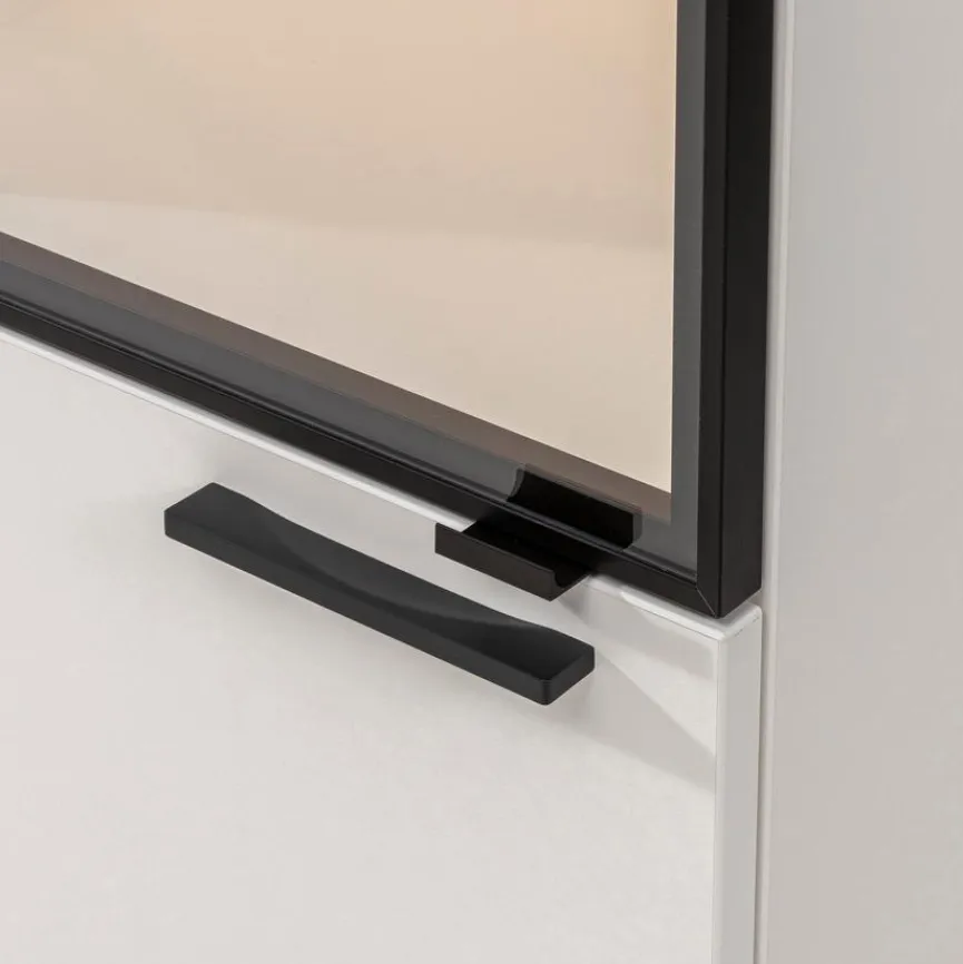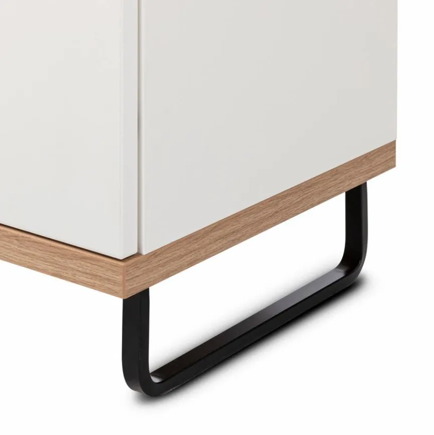 - Korpus und Front aus Holzwerkstoff (Spanplatte) mit kratzfester Melaminharzfolie in Polarweiß, Absetzung aus Holzwerkstoff (Spanplatte) mit kratzfester Melaminharzfolie in Artisan Eiche