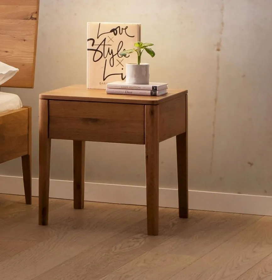 Der Nachttisch Styly von HASENA überzeugt durch seine schlichte Eleganz und die klare Linienführung. Diese Nachtkonsole ist aus massivem Holz gefertigt und wirkt robust und stabil. Besonders beeindruckend sind die sanft gerundeten Ecken, Kanten und Übergänge, die dem Nachttisch Styly eine feine Note verleihen. Dank der geräumigen Schublade haben Sie all Ihre wichtigen Dinge immer griffbereit.