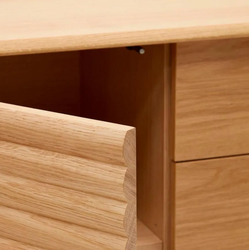 Mit dem Sideboard Lenon von Kave Home schlägt das Herz von Designliebhabern höher. Neben seiner exklusiven Form im angesagten 60er-Jahre-Style bietet die Kommode eine nahezu schnörkellose Optik, die lediglich durch das Relief an der Tür durchbrochen wird. So lässt sich das Sideboard Lenon wunderbar als attraktiver Blickfang im Wohn- oder Schlafzimmer inszenieren.
