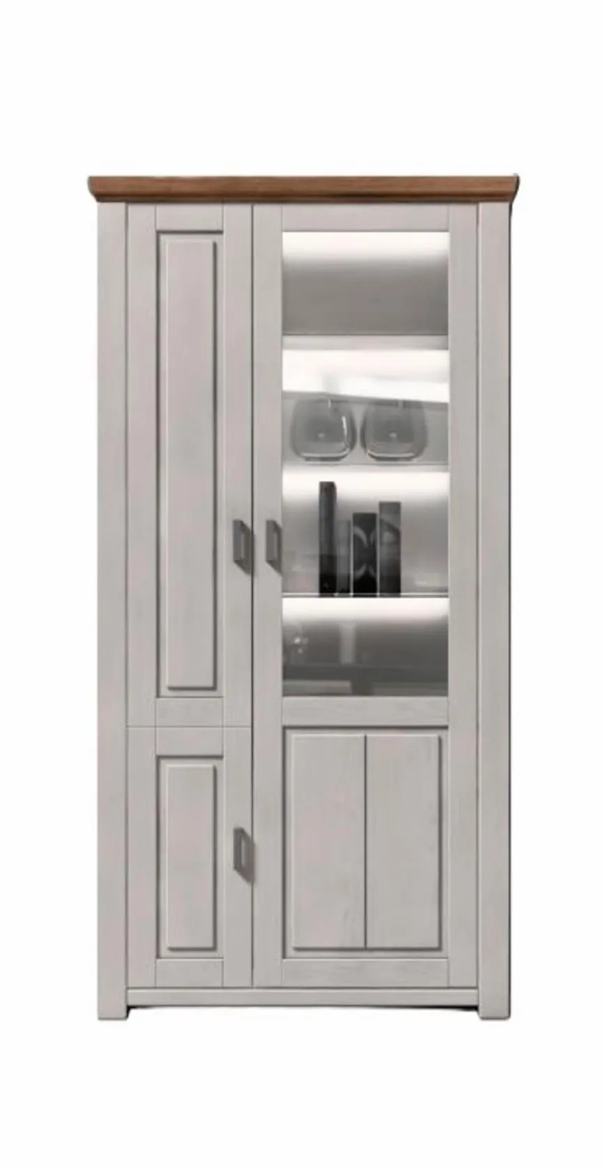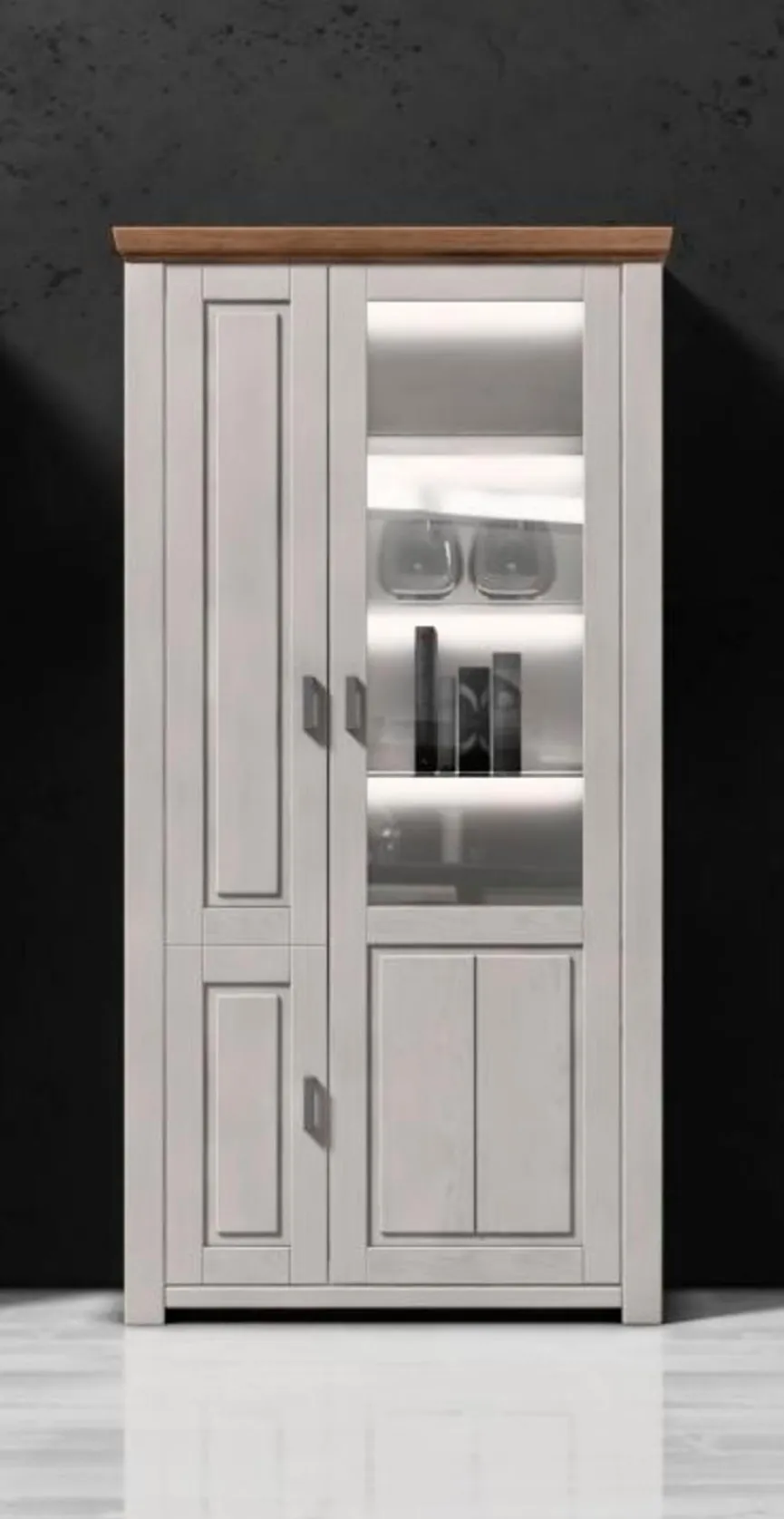 - Vitrine bestehend aus: 1 Glas/Holztür breit rechts, 1 Holztür hoch links oben, 1 Holztür klein links unten, 4 Holzböden + 1 Konstruktionsboden links, 1 Holzboden + 1 Konstruktionsboden rechts