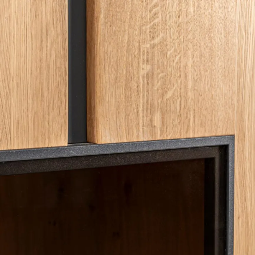 - Front aus vollmassiver Wildeiche, Korpus aus Holzwerkstoff (Spanplatte) mit hochwertiger Dekorfolie in Wildeiche furniert, Absetzung aus geölter Natureiche mit Ornament in Anthrazit