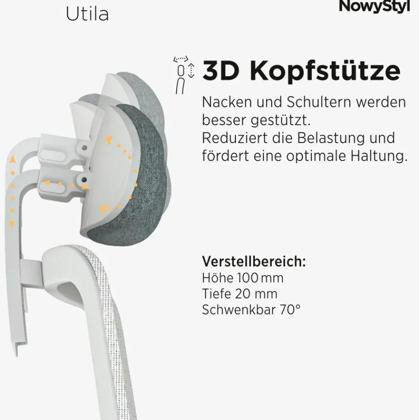 - Inkl. 3-D Armlehen in hellgrau mit weicher Armpadauflage in schwarz und 3-D Kopfstütze
