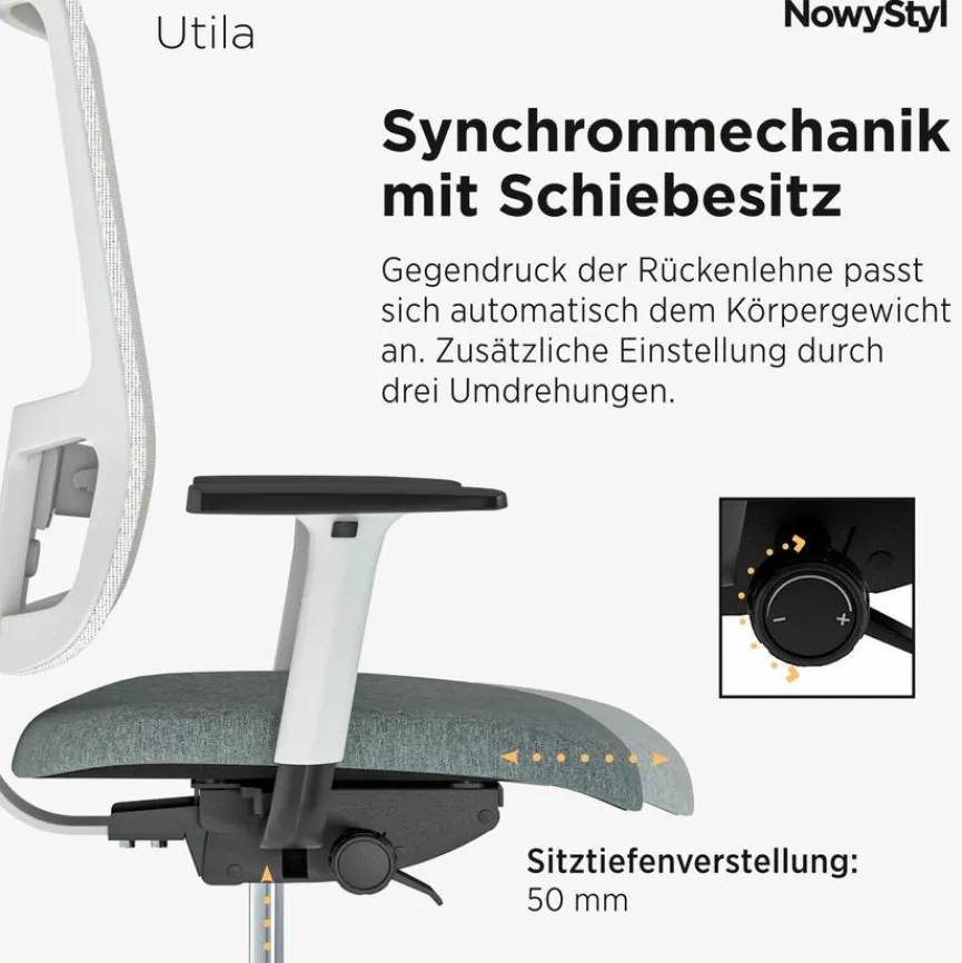 - Rückenlehne höhenverstellbar, Synchronmechanik mit neigbarer Rückenlehne für ergonomisch korrektes Sitzen mit Arretiermöglichkeit und Sitztiefenverstellung