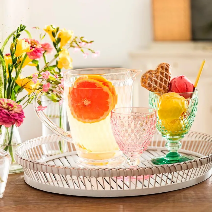 Der hübsche Krug Boston 1300 ml von Villeroy & Boch ist ein unverzichtbares Accessoire zum Servieren köstlicher Getränke. Er hat eine durchsichtige Optik und begeistert durch die attraktive Struktur seiner Oberfläche. So sorgen Sie mit dem schicken Krug Boston 1300 ml für ein stilvolles Flair auf Ihrem gedeckten Tisch und haben stets ein praktisches Gefäß für Ihre liebsten Erfrischungen.