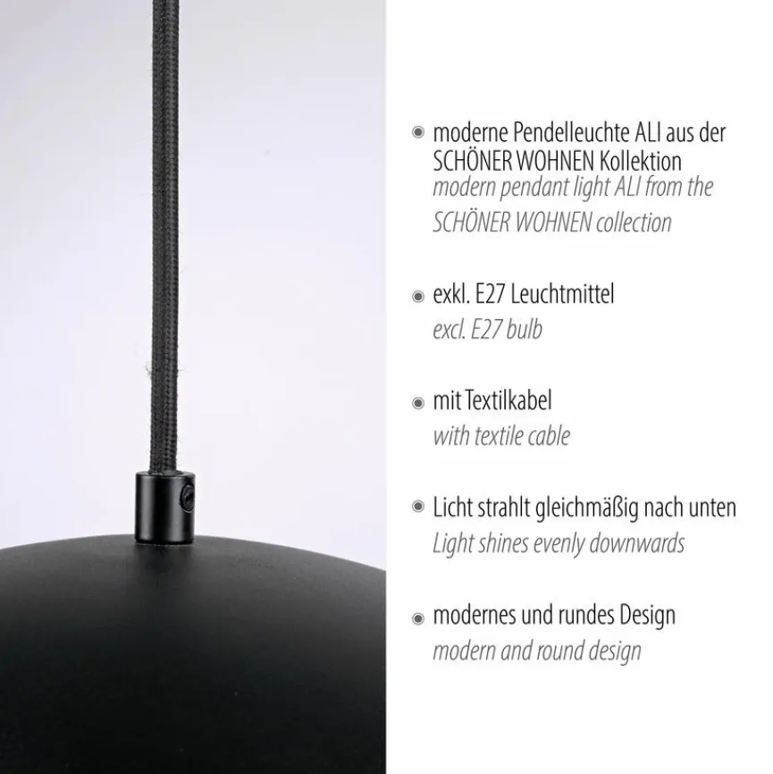 Die Pendelleuchte Ali aus der SCHÖNER WOHNEN-Kollektion verleiht jedem Wohnraum ein gehobenes Ambiente. Als Pendellampe schafft sie einen eleganten Hingucker und setzt ein klares Designstatement. Darüber hinaus bietet die Pendelleuchte Ali ein angenehmes Licht und erzeugt somit eine Atmosphäre zum Wohlfühlen und Entspannen.