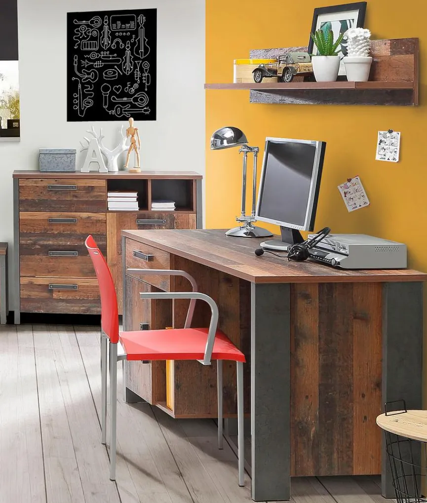 Mit dem Schreibtisch Clif schaffen Sie in Ihrem Homeoffice ein stilvolles Ambiente. Das markant gemaserte Holz wurde mit Elementen im Betonlook kombiniert, wodurch dieser Tisch extravagant und sehr attraktiv wirkt. Darüber hinaus bietet Ihnen der Schreibtisch Clif viel Stauraum für Ihre Büroutensilien.