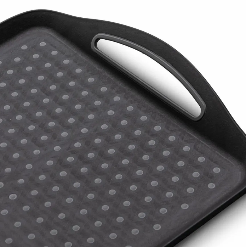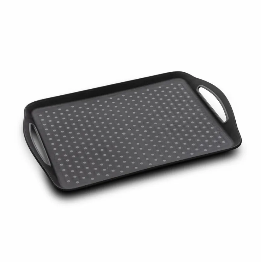 Das praktische, mit einem umlaufenden, erhöhten Rand versehene Tablett 45,5×32 cm erleichtert das Auf- und Abtragen von Geschirr und Speisen. Dank der rutschfesten Gumminoppen auf der Oberseite des unzerbrechlichen Utensils gestaltet sich der Transport noch sicherer. Wer seinen Haushalt mit einem nützlichen Accessoire ausstatten möchte, trifft mit dem Tablett 45,5×32 cm eine gute Wahl.