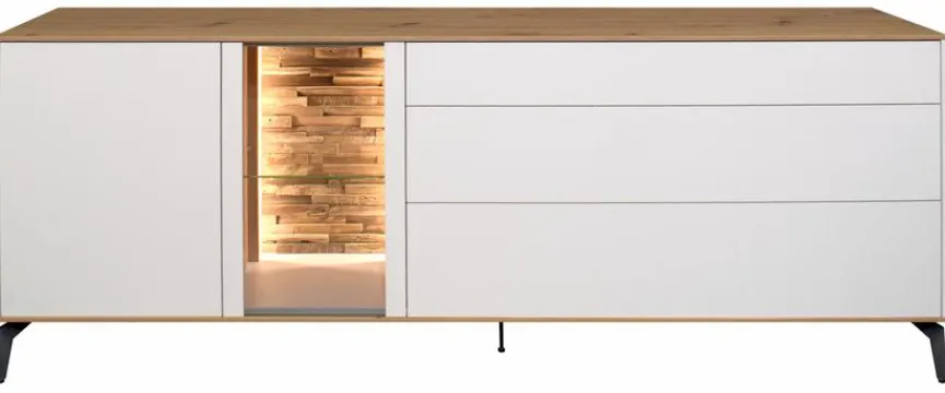 - Mit 1 Tür, 1 Glastür, 1 Klappe und 1 Schubkasten mit Selbsteinzug